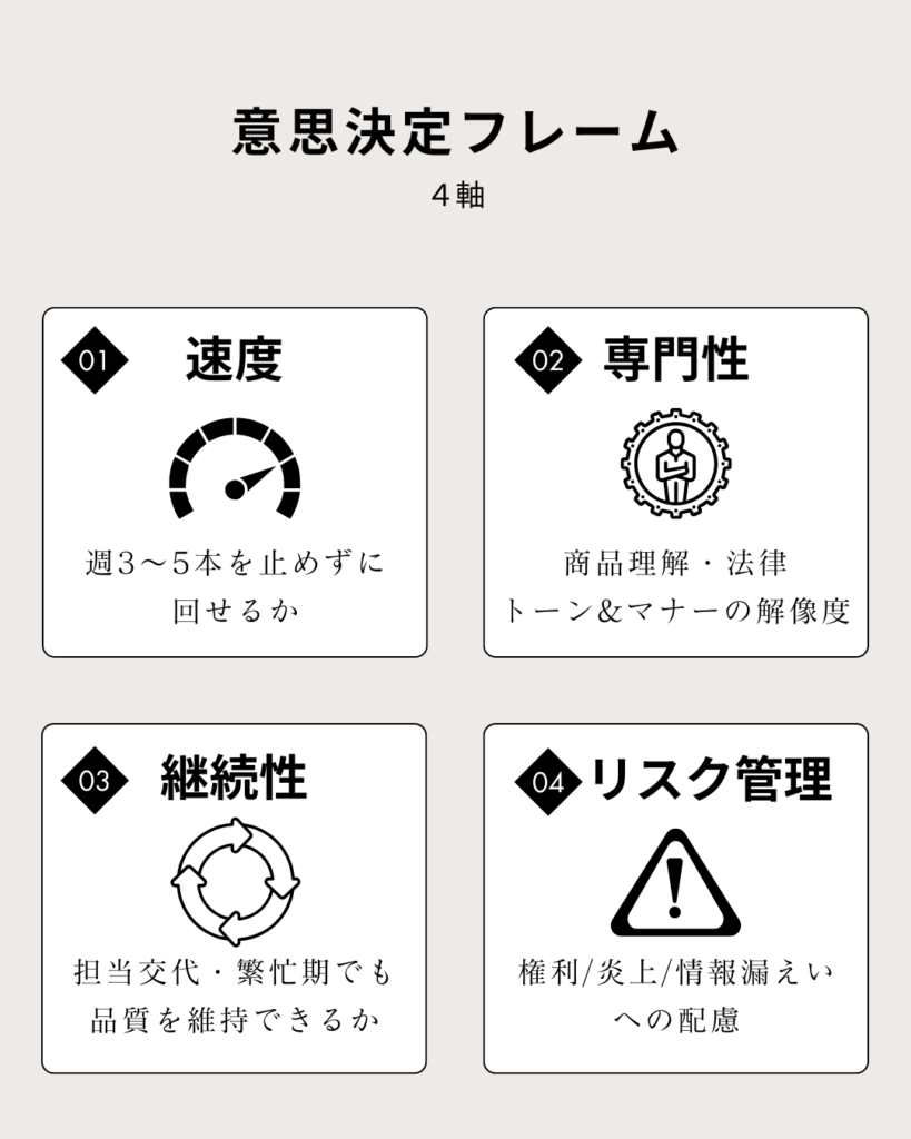 の4点です。まずは意思決定の枠組みを整えましょう。