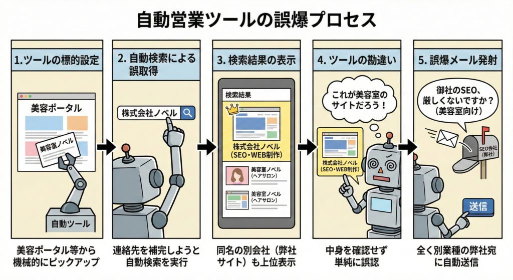 現在、BtoBの営業現場では、Web上の企業情報を自動で収集し、問い合わせフォームにテンプレート文章を一斉送信する「自動化ツール」が多く活用されています。今回の誤爆は、おそらく以下のような流れで起きたと推測されます。