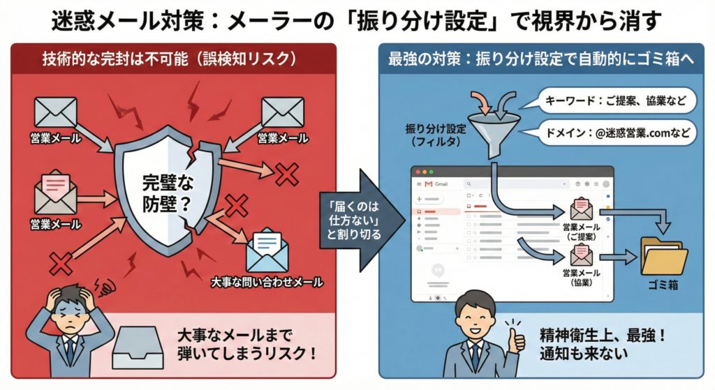 正直に申し上げますと、どれだけ対策しても、営業メールを技術的に完封することは不可能です。