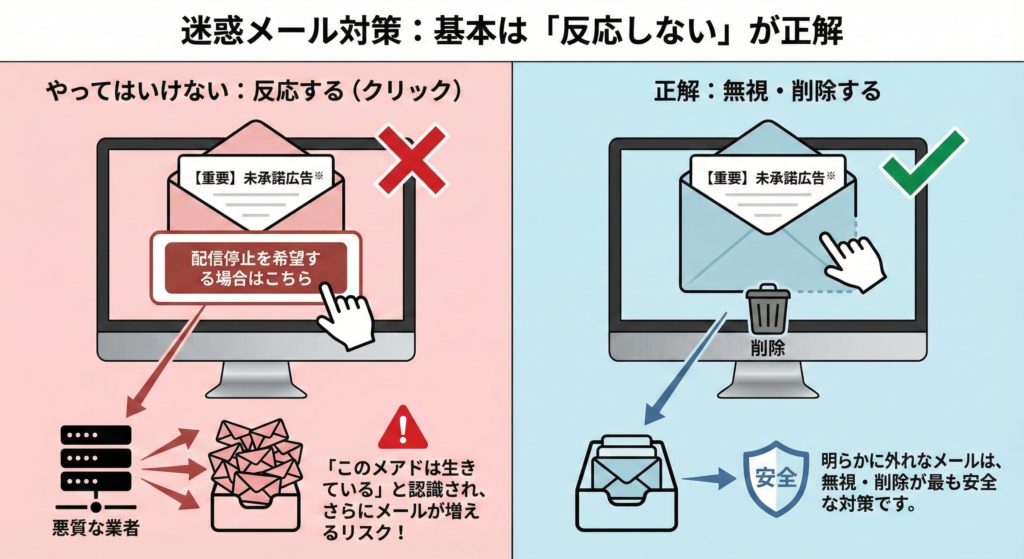 「配信停止を希望する場合はこちら」というリンクがある場合もありますが、悪質な業者の場合、クリックすることで「このメールアドレスは生きている(反応がある)」と認識され、さらにメールが増えるリスクがあります。