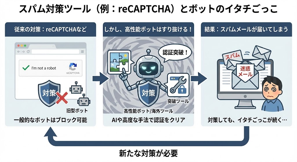 Googleが提供する「reCAPTCHA(リキャプチャ)」などの対策ツールは有名ですが、正直なところ、最近の高性能なボットや海外のツールは、これをすり抜けてくることがあります。