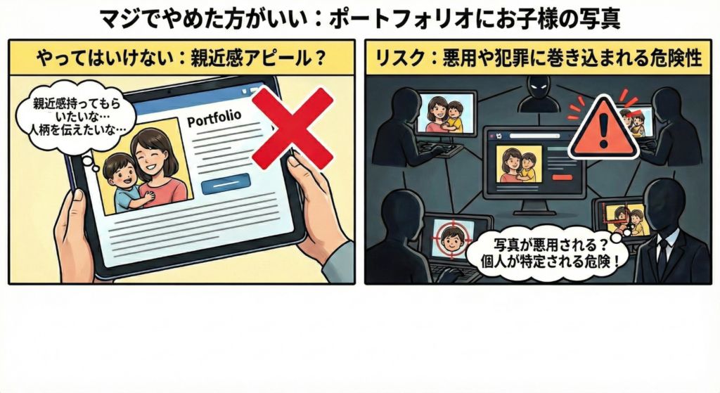「お子様の写真を載せて、パパorママ頑張ってますアピール」をするのは、不特定多数への営業では控えてください。